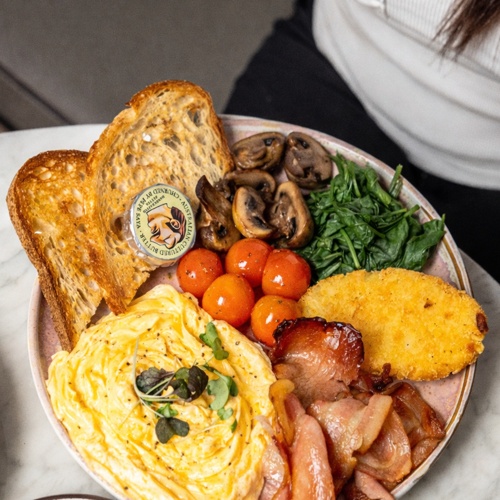 Sourdough toast, bacon, eggs, mushrooms, cherry tomatoes, hashbrown & eggs your way